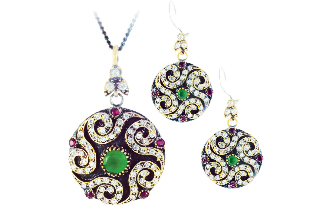 OTANTİK SET 1 ad. Kolye & 2ad. Küpe KÖK YAKUT VE ZÜMRÜT TAŞLAR KRİSTAL ŞEFFAF TAŞLARLA SÜSLENMİŞTİR.