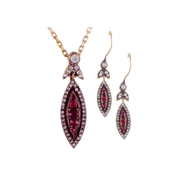 OTANTİK SET 1 ad. Kolye & 2ad. Küpe KÖK YAKUT TAŞLAR KRİSTAL ŞEFFAF TAŞLARLA SÜSLENMİŞTİR.