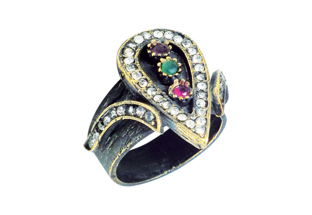 OTANTİK YÜZÜK 7-8-9 KÖK ZÜMRÜT VE YAKUT TAŞLARIN ÇEVRESİ KRİSTAL TAİŞALARLA ÇEVRİLMİŞTİR.