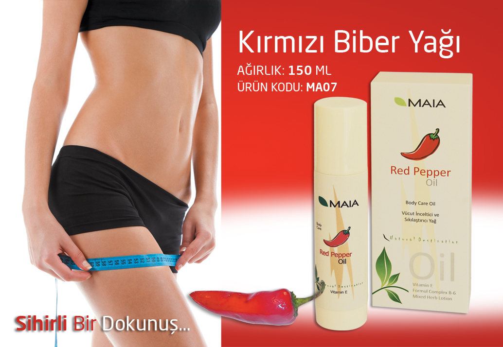 Kırmızıbiber yağı ve losyonu tamamen doğal olup hiçbir kimyasal içermeyen bir formülden oluşan kombine bir üründür. Güney Amerika da yetişen Meksika biber extraklarından elde edilmiştir. Bölgesel zayıflamada mükemmel sonuç veren bu kombine ürün aynı zamanda portakal kabuğu görünümünde de ciddi azalmalara büyük katkı sağlar. Kilo alıp vermeden oluşan kol altı sarkıntıları için destekleyici bir özelliğe sahiptir.