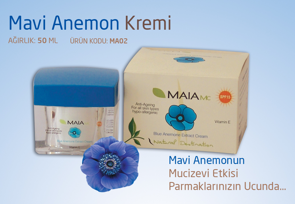 Mavi Anemon içermiş olduğu kinetin sayesinde yaşlanma belirtilerini ve cilt lekelerini azaltmaya yaşlanmaya bağlı ince çizgileri germeye katkı sağlar. Cilde canlılık ve elastikiyet sağlamaya ve cildin nem oranının dengelemeye faydası olur. Ve aynı zamanda içerdiği SPF 15 sayesinde cildi UVB ışınlarından koruyan etkili bir nemlendiricidir.