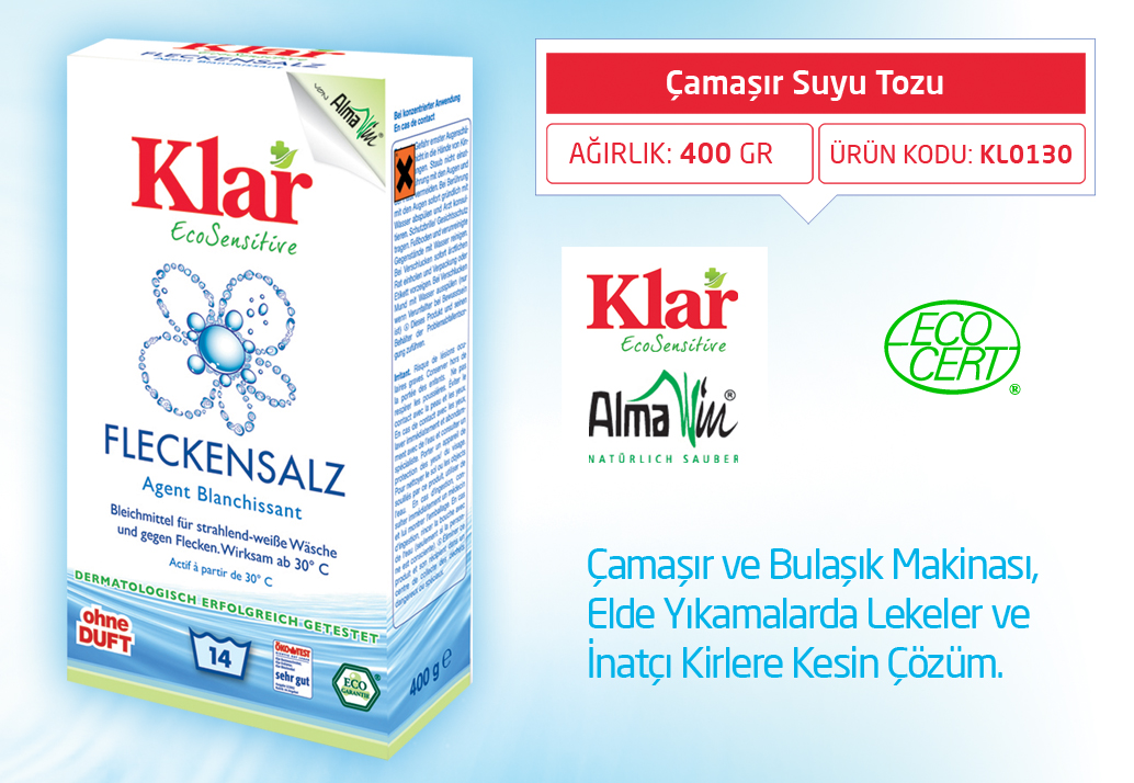 Kar gibi beyaz çamaşırlar elde edebilmek için Çamaşır makinanızın Ana yıkama deterjan bölümüne 25 ml Leke çıkarıcı Organik Çamaşır suyu tozu ilave ediniz. Renkli çamaşırlarda kullanmadan önce görünmeyen bir yerinde renk haslığını kontrol ediniz.